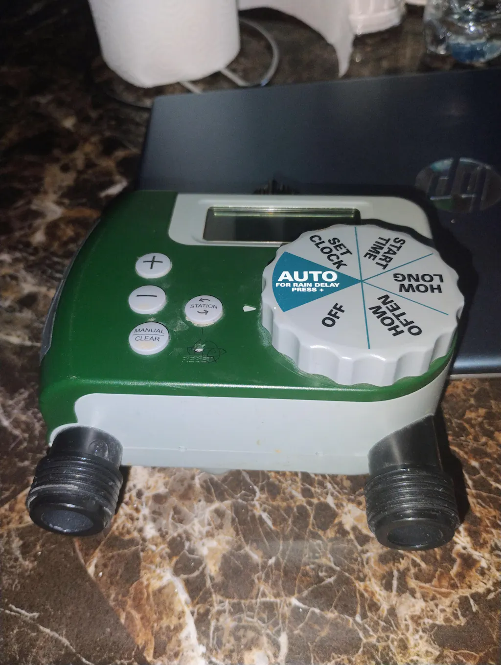The Orbit 2-Outlet Hose Faucet Timer will turn your hose faucet into a programmed sprinkler system in minutes. No more dead plants because you forgot to water them. No more soggy lawns and wasted water because you forgot to turn the water off. Just set the timer and go. Don't forget you're saving water and saving money on your watering bill. This timer features simple, easy installation and programming. There is no need for tools. Just set the start time, watering duration, and frequency. Plus, the timer retains the program while changing the battery. The large, easy-to-read dial and LCD screen make programming easy. A manual button allows instant faucet use without interrupting your set program. Built-in rain delay pauses your programmed schedule for 24-, 48-, or 72-hours. Programmed on/off times save water and are perfect for drought and non-drought conditions. Built with high-quality materials and water-resistant construction, you can count on many years of dependable use.