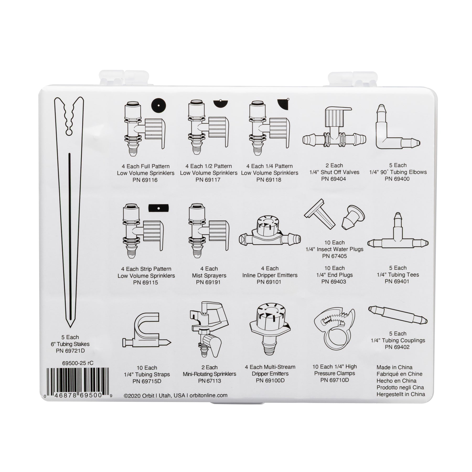 The hard plastic case keeps parts organized and easily accessible and includes an illustrated product key card for easy part identification. Compatible with drip fittings from Orbit, Hydro-Rain, and other major brands, which makes the kit easily expandable. For outdoor irrigation use with cold water only.
