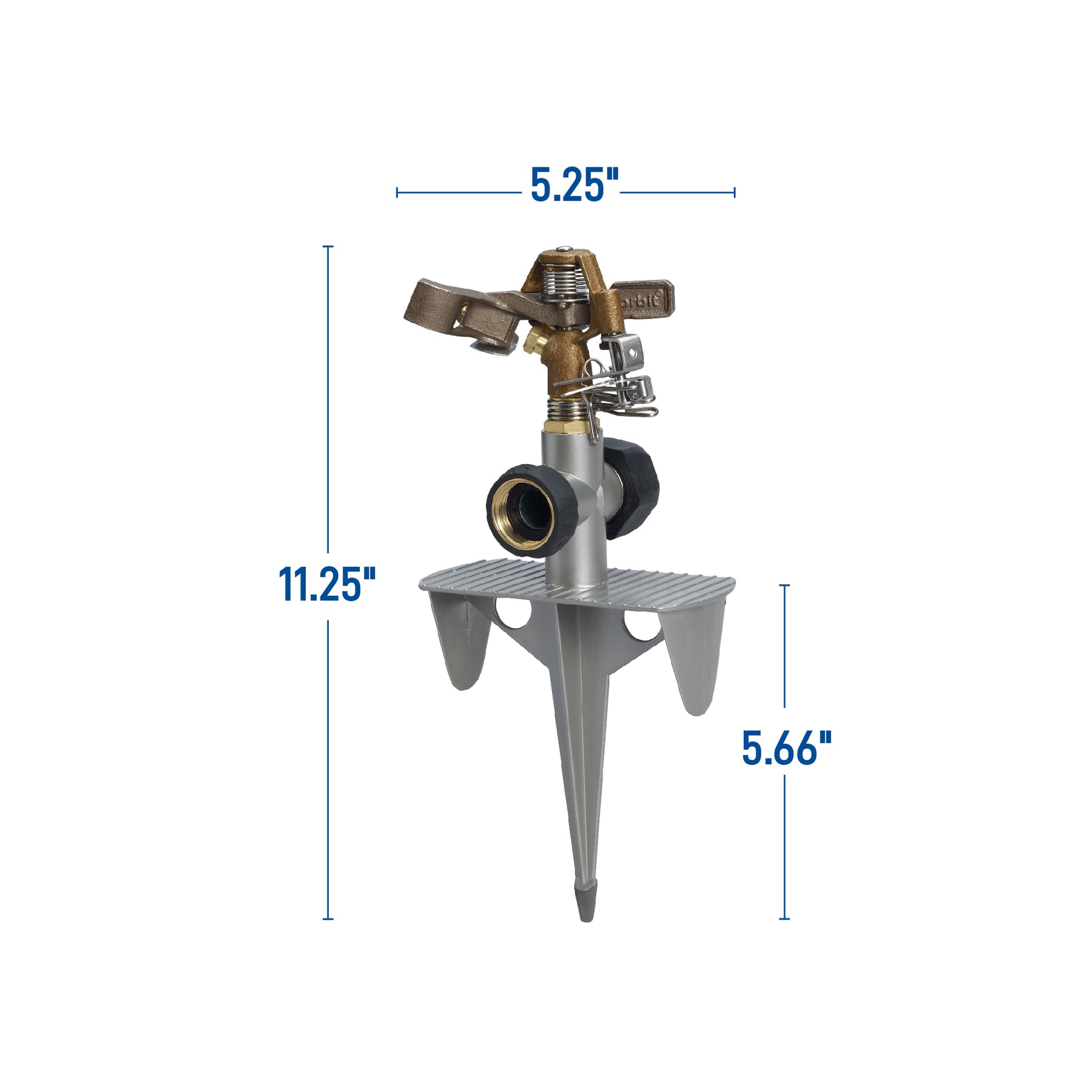 The Orbit Brass Impact Sprinkler on Tri-point Step Spike is ideal for watering large areas. Designed for dependability, impact heads have an uninterrupted water flow and are clog-resistant, even when used with dirty or reclaimed water from ponds and canals. Attached to a heavy-duty step spike, this sprinkler sprays up to a 90-ft. diameter. Easily adjust the coverage from a partial section to a full circle. Features a deflector shield for distance adjustment and an anti-backsplash arm to aid in spray pattern and area coverage. A simple twist of the diffuser screw breaks up the water stream, creating larger or smaller water droplets. The flow-through outlet allows you to connect multiple sprinklers to expand your watering areas depending on water pressure. The all-metal construction is designed to hold up against the typical wear and tear that most impact sprinklers experience, giving you years of dependable use.