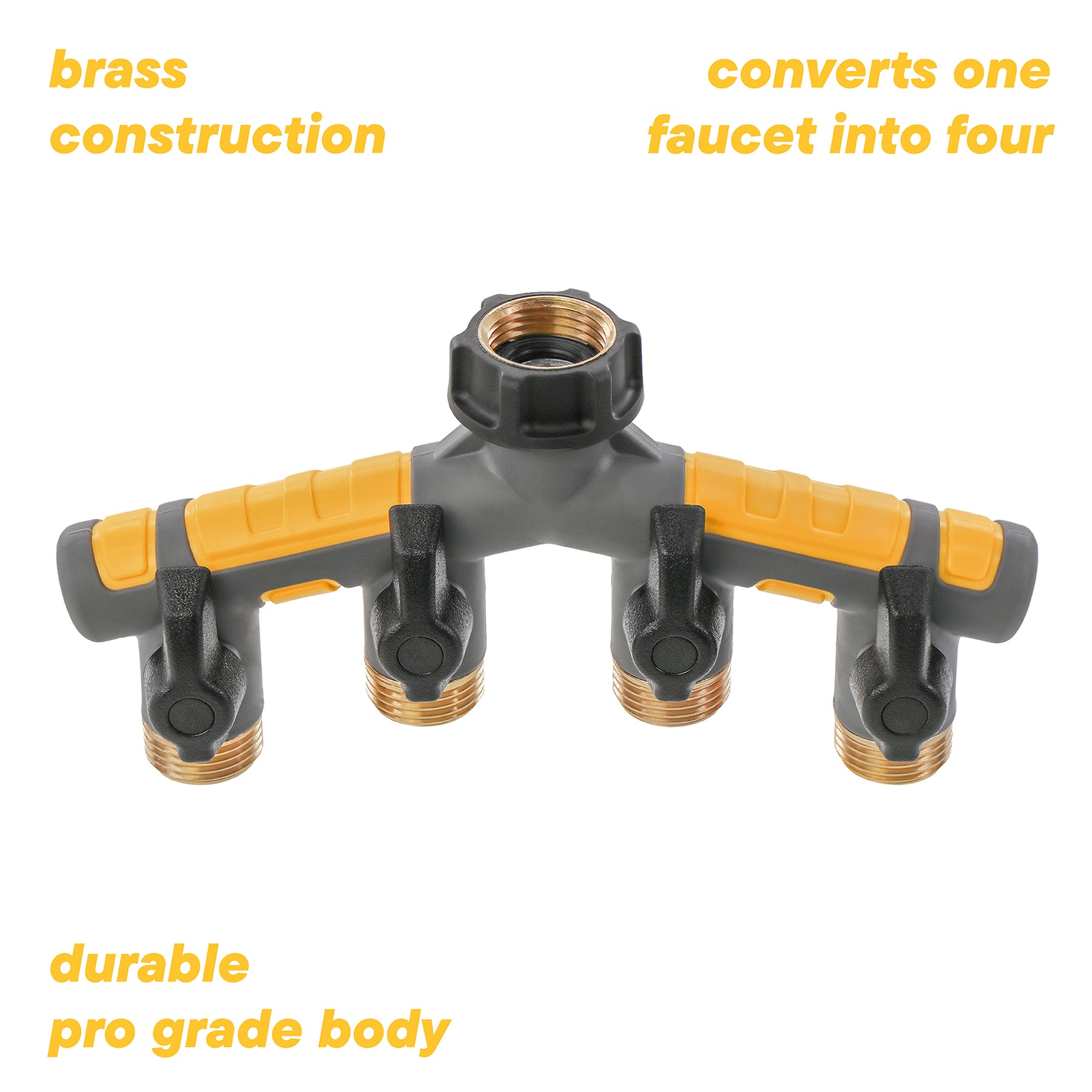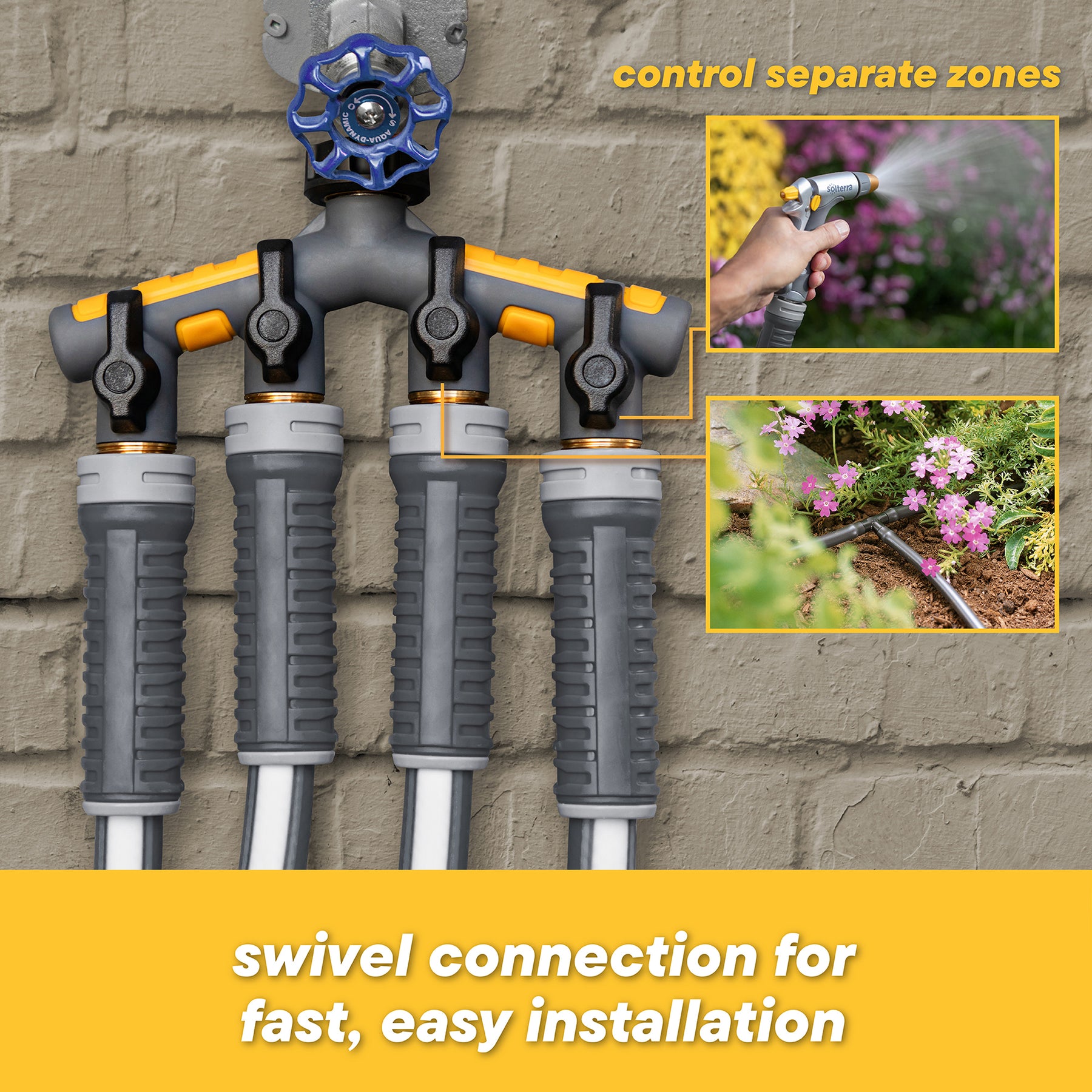This metal hose faucet manifold converts your faucet into a 4-faucet hose connection. Convenient valve controls let you adjust the flow, or shut-off each connection individually. The 3/4" male-threaded connection has a brass swivel head with comfort grip for easy installation. Heavy-duty construction with leak-free ball valves ensures quality performance.