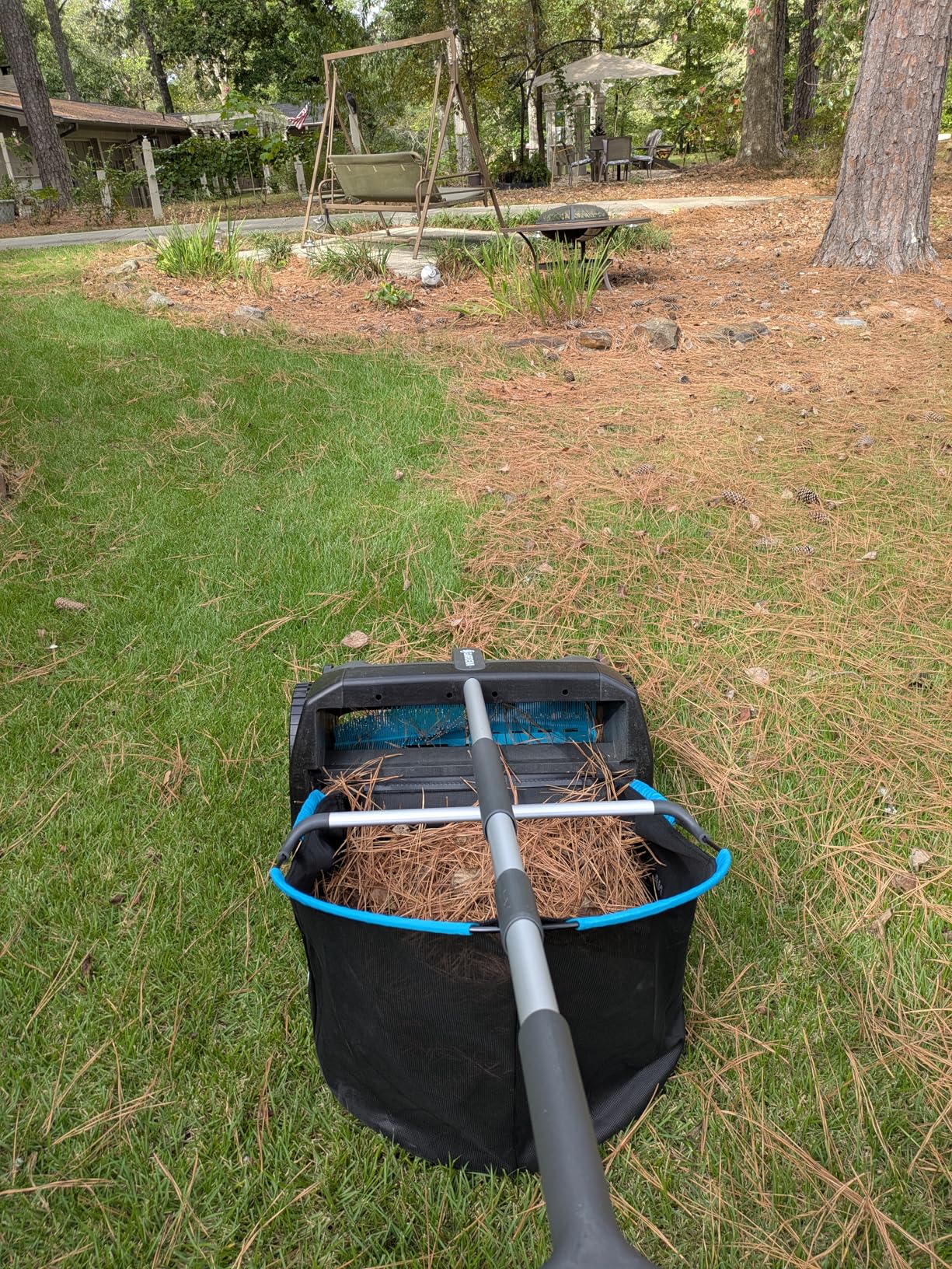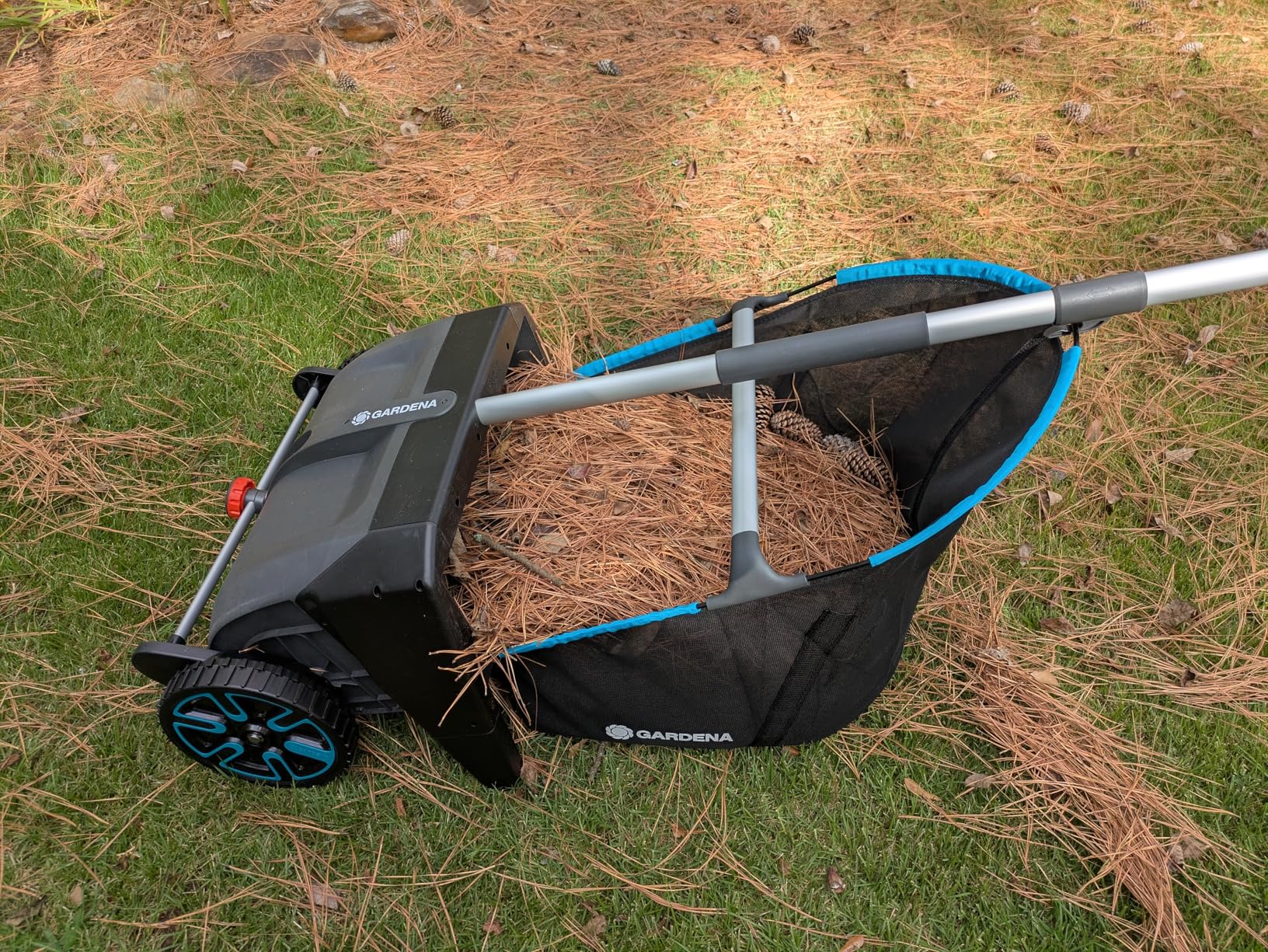 The spacious mesh collection bag holds up to 24 gallons of debris and detaches instantly with a simple release mechanism, making it easy to empty at your compost pile or disposal area without lifting or tilting the entire unit.