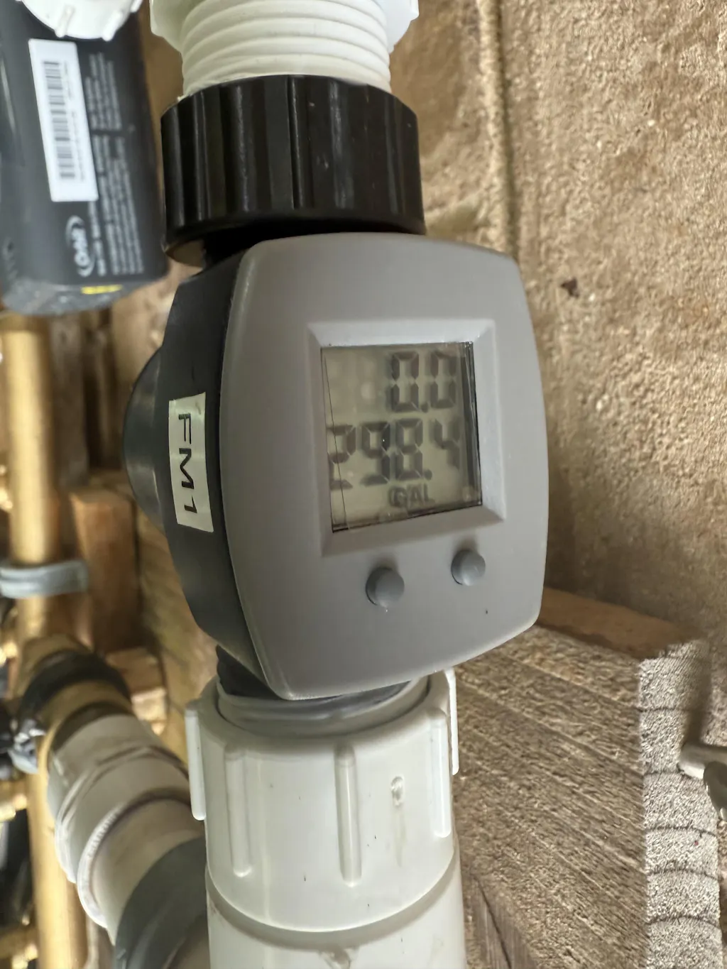 The Orbit flowmeter is reset to 0.0 gallons (press both buttons) for the event and the history each evening before next morning watering cycle. This daily reset will then record the actual 24 hour watering cycle total water usage for the residential irrigation hose system, which delivers an average of 1500 gallons in a 2 day period, thus exceeding the flowmeter 999.9 gallons readout limit. The flowmeter daily readout gallons used is recorded each day with a photo.
