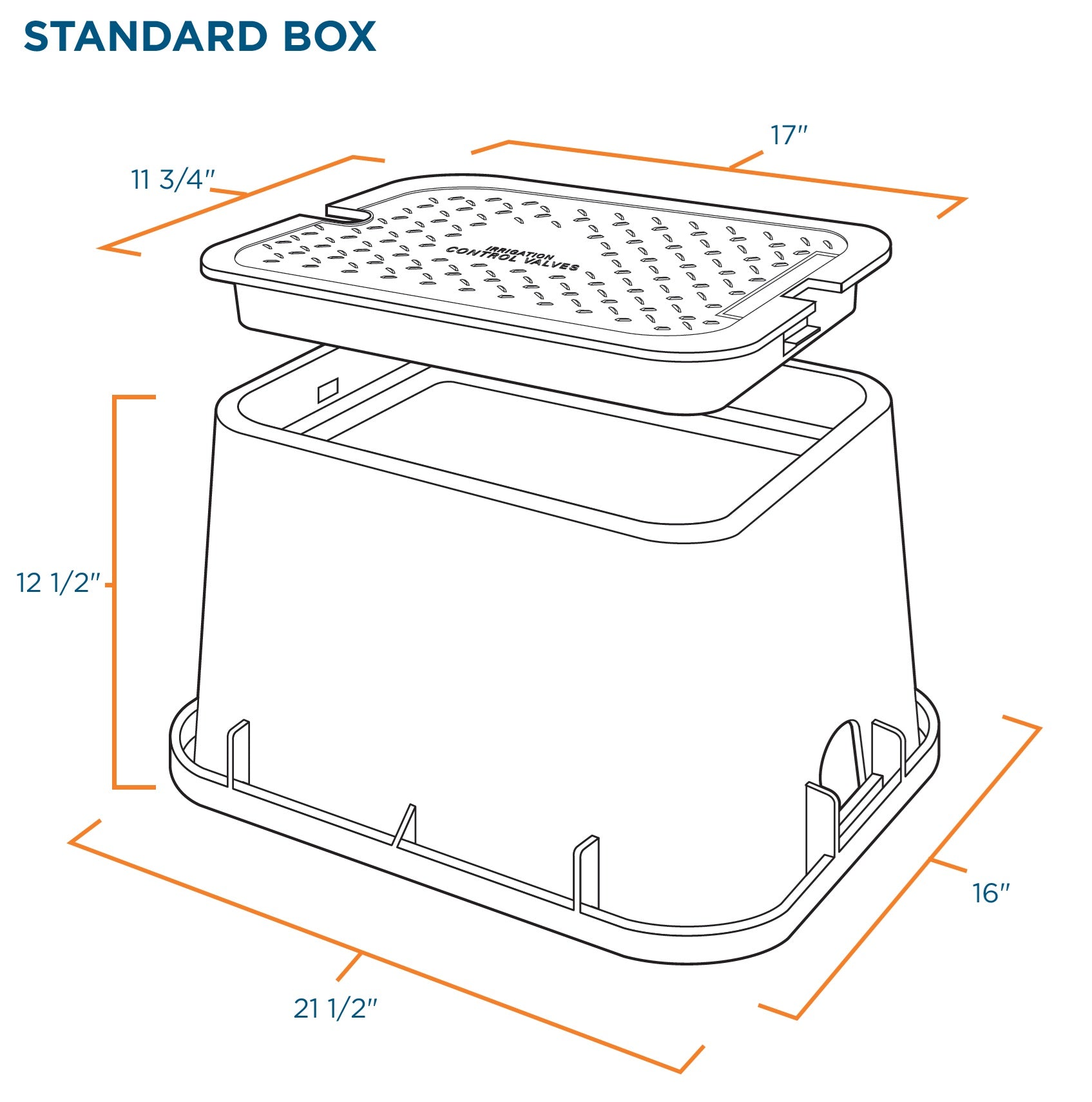 The rectangular valve box is designed to protect manual and automatic irrigation control valves, as well as meters, filters, and quick coupler valves. It is constructed from high-density polyethylene (HDPE) which enables it to stand up to UV, freezing and lawn equipment. Mousehole-shaped openings in the bottom of the box allow up to 2-in. pipe to pass through without cutting. The reinforced lid snaps securely onto the box. We recommend using the optional valve box base with the standard valve box, installing the valve box lid at grade level, and applying gravel beneath the base to promote drainage and prevent settling. Compatible with Orbit’s preassembled manifold system and components, as well as valves, filters, pipes, and fittings from Orbit, Hydro-Rain, and other major brands. For outdoor irrigation use with cold water only.