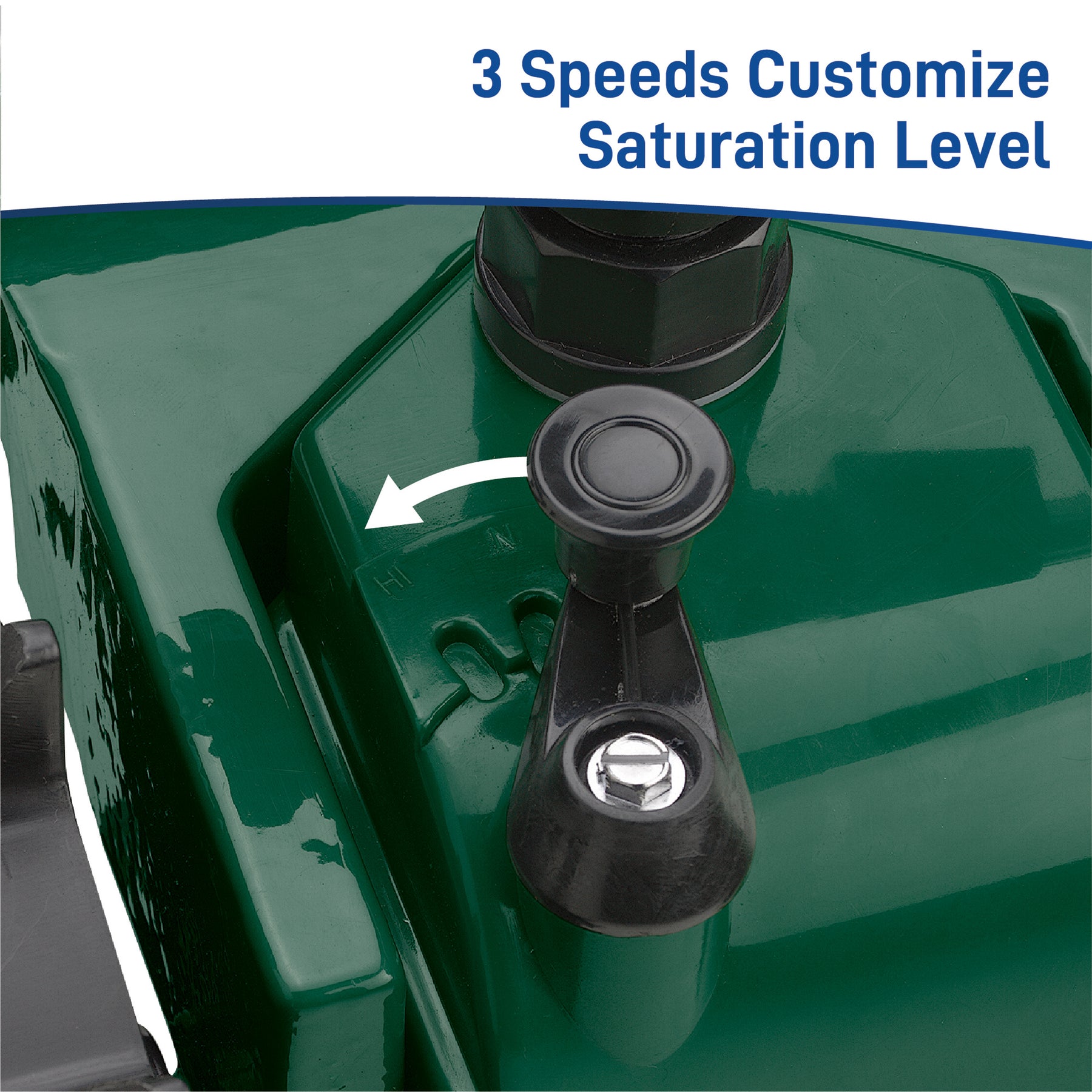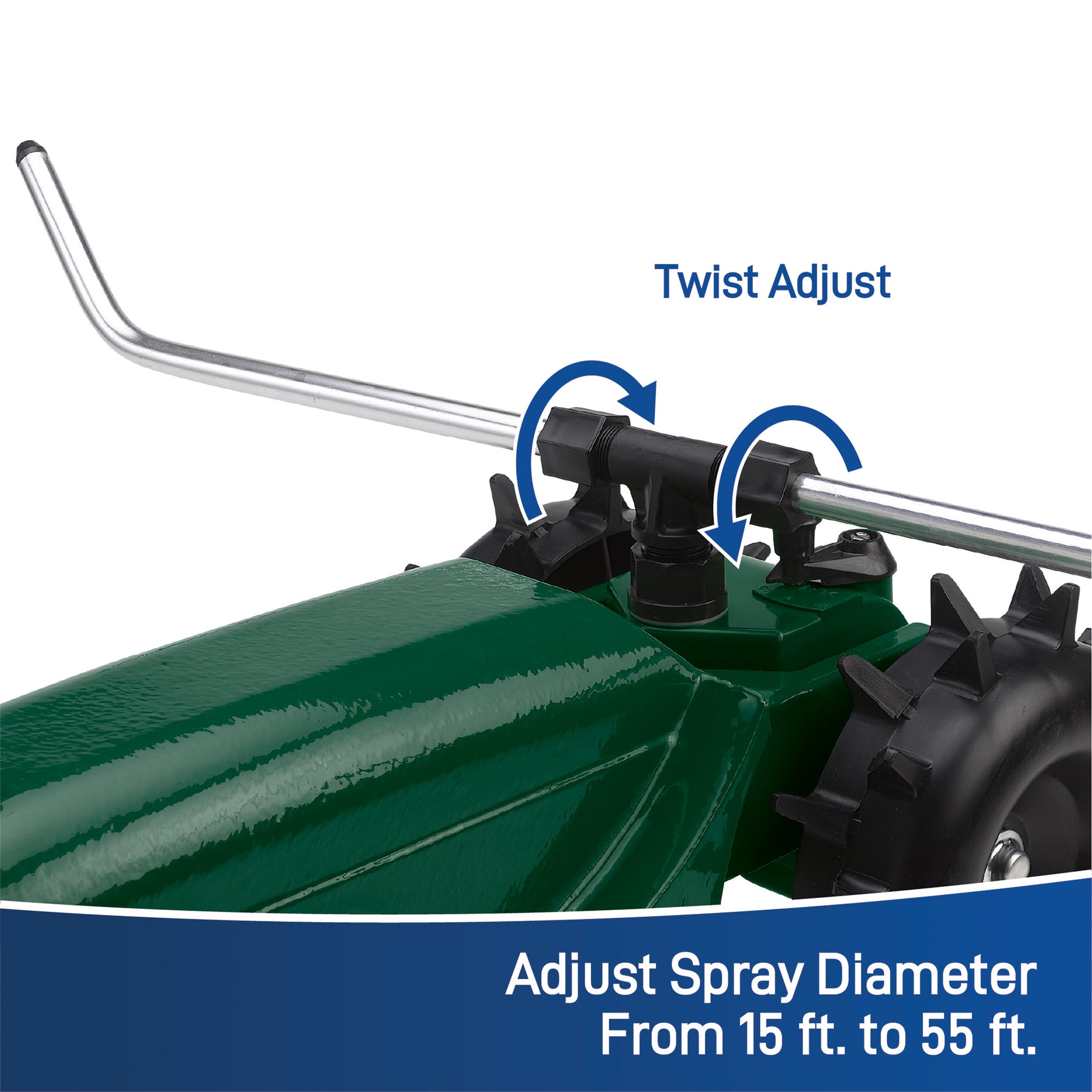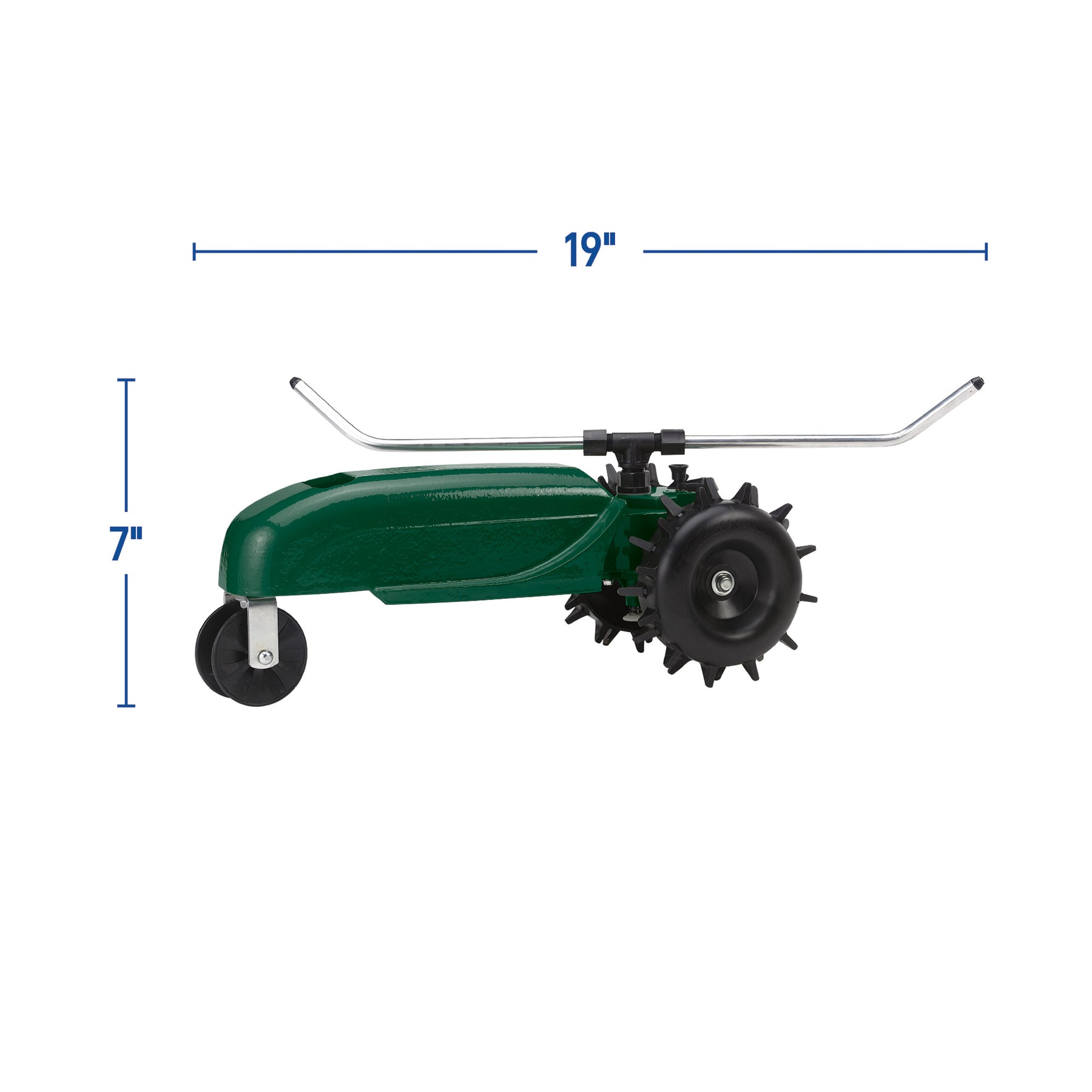 Let your sprinkler do the moving for you. Orbit’s Traveling Sprinkler is a self-propelled sprinkler that uses water pressure to move along a hose path that you set to create your personalized watering system (hose not included). Compatible with 5/8-in. hose, this sprinkler can traverse up to 200 ft. The body is made of cast iron, which weighs the sprinkler down and ensures it travels along the hose path without stalling. Spiked rear wheels and durable gears provide smooth, dependable travel. The rotary spray provides even coverage; simply twist each spray arm to adjust the watering diameter from a minimum of 15 ft. to a maximum coverage of 55 ft. Its three-speed settings allow for different rates of coverage; select from high, low, or neutral speed control. In high gear, the sprinkler travels approximately 37 ft. per hour and applies about ¼ in. of water. In low gear, the sprinkler travels approximately 21 ft. per hour and applies about ½ inch of water. Set it to neutral to use it as a stationary sprinkler. Use the specialty ramp to stop at any location along the hose length to turn off the sprinkler – the sprinkler stops when its shut-off plunger contacts the ramp stop.